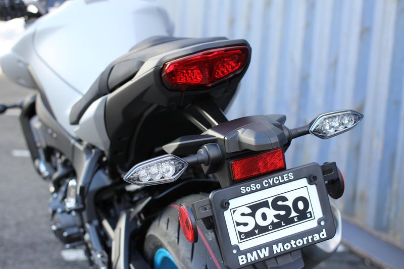 A stripped-down look is achieved by removing unnecessary bodywork elements and refocusing attention on the pure mechanical beauty of the muscular engine and compact frame. Twin-eye mono-focus LED headlights and LED position lights situated above the headlights combine with a compact nose assembly to minimize overhang and lend a refined, dominant style. Enlarged, functional intake ducts mounted on either side of the fuel tank cover increase efficiency while further enhancing the bike's aggressiveness.